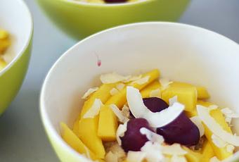 - flocons d'avoine - lait de coco - miel - 1 belle mangue - copeaux de noix de coco -