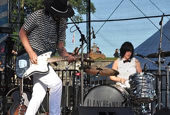 On a commencé avec une totale découverte : BLANCHE ET NOIR un couple de rockeurs du Québec. Nom de scène égale tenue de scène : tous les deux portent des vêtements noir et blanc à motifs, réhaussés d'un nœud papillon. Forcément on pense aux White Stripes ou aux Kills, mais Blanche et Noir vont plus loin, ils explorent des recoins grunge et hard-rock (" Sans raison ") à l'aide de leur deux instruments. Jean est à la guitare, Amanda à la batterie, et le duo s'éclate face au public du Coeur du FEQ.