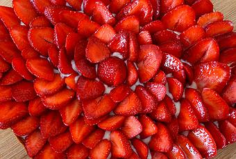 3. Une fois que vous avez terminé la cuisson de la pâte et que la crème pâtissière est refroidie, vous pouvez passer au montage de la tarte ! Étalez la crème pâtissière sur tout le dessus de la pâte sablée. Découpez vos fraises en 3 ou 4 morceaux dans le sens de la hauteur puis disposez-les en quinconce, le bas de la fraise à l’extérieur. Réservez au frais pendant quelques heures.