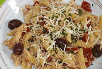 Ingrédients : 200g de pennes - 1 boite de thon au naturel de 150g - 1 petite pincée de piment d'Espelette - 60g d' olives noirs de Nyons - 1/2 bocal de tomates séchées à l'huile -