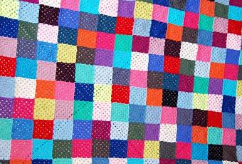 Puis... x années après... après avoir fait un tour chez Baudilaine et vu leur superbes couleurs, j'ai repris une quinzaines de pelotes pour agrandir Elmer et lui faire une jolie bordure chamarrée en utilisant le moindre petit bout de laine.