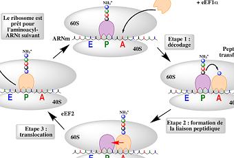 Elongation de la traduction de l'ARN messager (ARNm) en protéine.