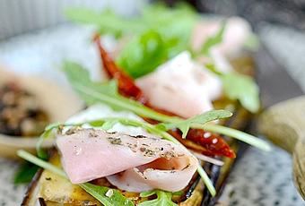 Ingrédients pour 4 personnes : 6 aubergines - 300 g de Prosciutto Cotto Bonneterre - 200 g de Feta grecque AOP Bonneterre - 2 poignées de roquette - quelques feuilles de basilic - un bouquet de thym - huile d’olive - sel et poivre