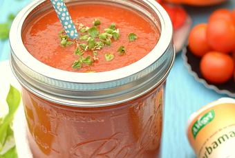 - Dans un blender, mixer l'ensemble des ingrédients de la recette jusqu'à obtention d'un liquide homogène. Ajouter un peu d'Herbamare Spicy, goûter et rectifier l'assaisonnement si besoin. Placer au réfrigérateur pendant minimum 2 heures.