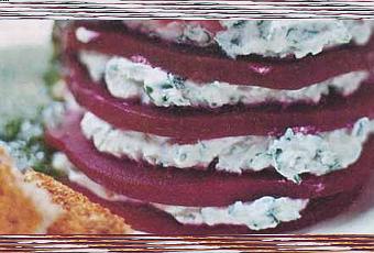 Dans chaque assiette, montez un marbré en faisant alterner tranches de betterave et mélange ricotta-ail-fines herbes. terminez par une tranche de betterave.