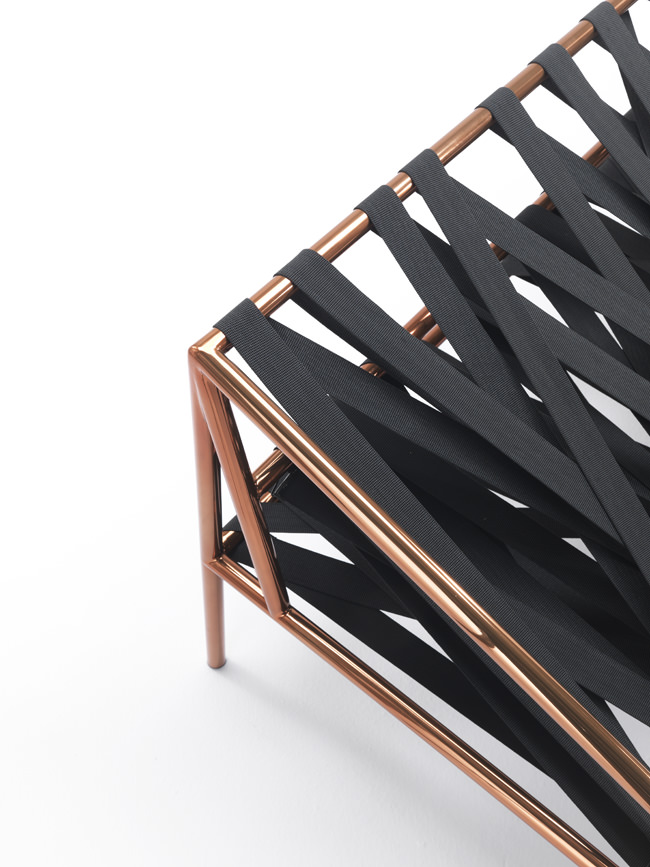 Une structure de cuivre dessinant les contours du banc, sur lesquels s’enroule 100 mètres de bande élastique permettant l’assise confortable. Un contraste marquant entre le métal, strict, droit, brillant et le textile, aléatoire, confortable et accueillant.