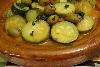 1. Dans une cocotte-minute, verser l'huile d'olive, ajouter l'oignon et l’ail hachés, cuire à feu moyen pendant environ 5 minutes.2. Ajouter les morceaux de viande et les épices, couvrir et laisser cuire à feu moyen jusqu’à ce que la viande devienne un peu tendre. Ajouter les tomates coupées en petits morceaux et laisser cuire environ 5-8 minutes. (Si vous avez un tagine, y transférer le mélange)3. Ajouter les courgettes coupées en rondelles, couvrir et laisser cuire à feu très lent jusqu’à ce que les courgettes soient cuites mais pas trop tendres. Retirer du feu, ajouter la coriandre ou le persil hachés et les olives épicés. ****************************1. In a pressure cooker, pour the olive oil, add chopped onion and garlic, cook over medium heat for about 5 minutes.2. Add the meat pieces and the spices, cover and cook over medium heat until the meat is just tender. Add the tomatoes cut into small pieces and cook for about 5-8 minutes. (If you have a tagine dish, transfer the mixture to the tagine)3. Add the zucchinis sliced, cover and let cook over very low heat until the zucchinis are done but not too soft. Remove from the heat; add chopped cilantro or parsley and the spicy olives.*********************************************************1. En una olla a presión, verter el aceite de oliva, añadir la cebolla y el ajo picados y cocinar a fuego medio durante unos 5 minutos.2. Añadir los trozos de carne y las especias, cocer a fuego medio hasta que la carne esté un poco tierna. Añadir los tomates cortados en trozos pequeños y cocinar durante 5-8 minutos.( Si usted tiene un tajine, transferir la mezcla en el tagine)3. Añadir el calabacín cortado en rodajas, tapar y cocinar a fuego muy lento hasta que el calabacín esté tierno pero no demasiado suave. Retirar del fuego, agregar el cilantro o perejil picado y las aceitunas picantes.********************************************************************1. في طنجرة الضغط ، يصب زيت الزيتون ، يضاف البصل و الثوم المفرومين ويطهوا على نار متوسطة الحرارة لمدة 5 دقائق .2. تضاف قطع اللحم و التوابل ، تغطى ويطهى الكل على نار متوسطة حتى ينضج اللحم بعض الشيء. تضاف الطماطم المقطعة إلى قطع صغيرة ويطهى الكل حوالي 5-8 دقائق. ( إذا كان لديك طاجين ، ينقل الخليط الى الطاجين )3. تضاف الكرعة الخضراء(كوسى) مقطعة الى شرائح ، يغطى الطاجين ويطهى الكل على نار هادئة جدا حتى تنضج الكرعة الخضراء(كوسى) لكن دون ان تصبح لينة جدا . يزال الطاجين من فوق النار ، تضاف الكزبرةأو البقدونس المفرومانوالزيتون الحار.