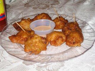Mais nous avons eu une soirée fort agréable quand même. Au menu, des lambis! Pour être honnête, je connaissais le coquillage, mais pas son nom, ni son goût. Son nom anglophone est "Conch", prononcé "konk". C'est LE produit local, ça et le mahi-mahi. Ce soir là, nous l'avons mangé en "fritters", c'est à dire un peu comme un beignet.Le reste du souper incluait une bière locale (bahamienne), nommée Kalik, du poisson frit avec du riz et pois (peas' n rice), puis un gateau au chocolat pour terminer... Un bon souper à saveur des Bahamas... miam!
