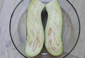 On commence par couper en 2 l’aubergine (ou les aubergines), on la met dans un plat allant au four micro ondes (pyrex par exemple) avec un couteau on fait des traits (diagonales), on ajoute 3 cs d’eau, on filme, on fait quelques trous dans le film et on programme 14 mn puissance max (moi 850 w).