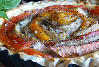 Oignons rouges, filets de rougets et poivrons confits font ici très bon ménage, et sont tout simplement mis en scène sur un fond de pâte feuilleté, croustillante et friable à souhait.