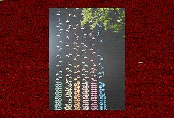 Nous avons pris le tramway à la station Avenue de France, un secteur en pleine démonstration architecturale à proximité du boulevard périphérique, et nous sommes descendus à la station Porte d’Italie. Après quelques pas vers l’Avenue d’Italie, nous avons vu cette façade colorée sur fond noir, une création de Mademoiselle Maurice sur un immeuble voué à la destruction dans un quartier en pleine transformation, rue Paul Bourget. 150000 origamis ont été réalisés et installés sur une façade peinte en noir : le titre de cette oeuvre, Cycles lunaires, nécessitait la nuit peut-être mais les couleurs vives des papiers pliés avaient aussi besoin de ce fond pour en faire jaillir la lumière. Quand on passe sous le porche qui perce cette façade, on trouve un espace vert (qui deviendra le jardin public du futur ensemble) et on voit la couleur des façades avant que soit étalée la peinture noire qui ferme le bâtiment vide de ses habitants. Les origamis peuvent aussi faire penser à toutes les vies qui sont passées ici et en sont parties depuis l’existence de cette cité. Les couleurs et l’idée de cycle (lunaire ou autre) expriment la puissance du renouvellement en cours.