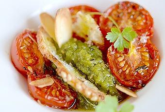 Ingrédients : 12 tomates cerise (un peu grosses !) - 4 cl d'huile d'olive - Quelques branches de thym - Quelques branches d'origan - Sel et poivre - Une ficelle (pain) - Quelques amandes éfilées - 1 pot de crème de basilic et parmesan Superproducteur