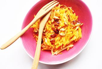 Pelez 1 courge butternut d’env. 500 g, mettez les graines de côté, puis râpez la chair au robot.