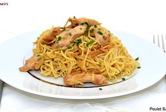 Aujourd’hui, je vous emmène en Asie pour un poulet plein de goût et de saveurs.Pour ce faire, j’ai utilisé de la sauce Teriyaki et de la sauce piment/gingembre de la marque Ayam.Ce n’est pas la première fois que j’utilise des produits Ayam (de nombreuses recettes sur le blog) et j’avoue n’en avoir jamais été déçue.La sauce Teriyaki est beaucoup utilisée dans la cuisine japonaise pour mariner viande, poissons et crustacés avant de les cuire ou de les griller.Elle donne une saveur très agréable à la viande. Pour donner plus de «force » à mon plat, j’ai rajouté un peu de sauce au piment, ail et gingembre. La quantité est selon le goût.On trouve facilement la sauce Takiyaki en vente dans les grandes et moyennes surfaces ou dans les magasins asiatiques. Sinon, vous trouverez toujours la recette de cette sauce sur le net.J’ai accompagné ce poulet de nouilles jaunes Ayam mais on peut aussi opter pour du riz.
