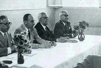 Distribution des Prix (30 juin 1953) de gauche à droite : Le rabbin Rouche, J. Braunschvig, J.D. Lévy et R. Tajouri