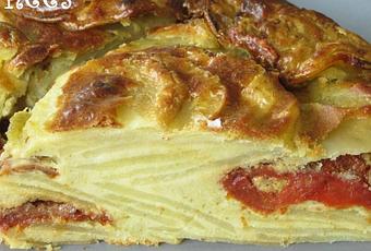 Disposer un tiers des pommes de terre dans un moule à manquer. Couvrir de la moitié des tomates séchées puis répéter l'opération. Couvrir avec le reste de pommes de terre.