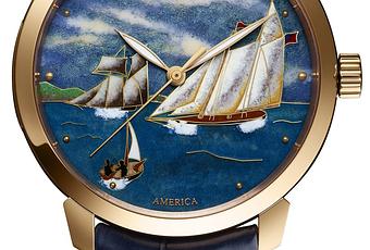 Au centre du cadran de 40 mm de diamètre, l' America est représentée dans toute sa splendeur sur un océan qui semble frémir à l'approche de la coque tranchante de la goélette rayant sa surface. En fond, même le décor dramatique de l'Île de Wight se fait petit devant le colossal gréement du voilier, dont on peut presque sentir la vitesse. C'est comme si l'on remontait le temps pour vivre en personne l'émotion de la victoire de l' America. Le thème nautique de la montre prend vie avec une force indéniable grâce à la technique de l'émail cloisonné.