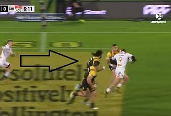 Barrett avait vu juste : aucun Chief ne récupère le ballon de volée. Lui a bien suivi le ballon et grâce à il est vrai à un rebond parfait, récupère le ballon. L’image ci-dessus est assez classique. Avec des soutiens trop lointains, Barrett va instinctivement vers l’espace en essayant de contourner le dernier défenseur James Lowe, grâce à sa vitesse. Jusque-là, on peut penser que Barrett va conclure l’action tout seul.