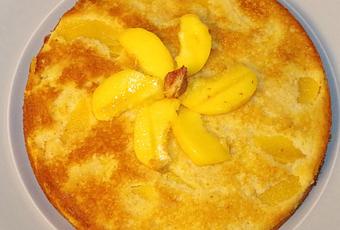 Ingrédients : 4 pêches jaunes - 150g de farine - 100g de sucre - 50g de beurre - 2 oeufs - 10cl de lait entier - 1 sachet de levure - 1 pincée de sel - 2 c à c d'extrait concentré de vanille.