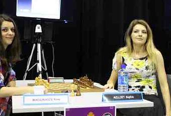 La partie de la ronde 1 dans la National féminin avec Nino Maisuradze et Sophie Milliet avec un avant-goût des élections FFE 2016 - toutes deux étant en position 2 de deux listes électorales - s'est soldé sur le partage du point dans un Gambit Dame accepté - Photo © Chess & Strategy