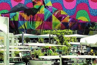 En ce moment la terrasse est aux couleurs du Brésil avec une immense illustration du Christ de Rio sur un pan de mur.