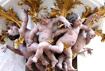 Les anges comme les démons et les dragons sont très présents à Füssen: la basilique Saint-Magne en a introduit bon nombre lors de la Contre-Réforme. Les plus remarquables sont ces putti qui s´entremêlent sous la base de la chaire de vérité, comme des enfants qui jouent entre eux. Ils donnent une impression d´abondance, de multitude, de joie et d´allégresse.