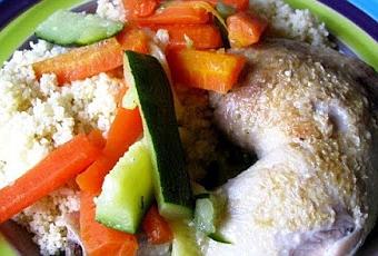 Dans une casserole, faire chauffer un peu d'huile d'olive pour y faire cuire le poulet. Pendant ce temps, éplucher les carottes et le navet, ainsi que la courgette en laissant quelques bandes de peau. Découper ces légumes en grosses lamelles. Lorsque le poulet est bien doré, les ajouter dans la casserole, sauf les courgettes. Ajouter le ras el hanout, recouvrir de bouillon bien chaud, et éventuellement d'un peu de tomates pelées ou d'une cuillère à soupe de concentré de tomates (suivant les goûts). Couvrir et laisser mijoter environ 45 minutes à feu moyen, en surveillant et mélangent un peu de temps en temps. Ajouter les courgettes les pois chiches au bout de 20 minutes de cuisson. Un peu avant la fin, faire cuire la semoule de couscous.