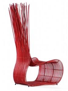Ce fauteuil est constitué d’une multitude de tiges en polyéthylène présentées et travaillées comme du rotin. Une structure en métal détermine la forme du fauteuil, chaque extrémités de la tige formant le dossier souple donnant hauteur et esthétisme à cette réalisation.