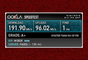 Pour ce mois d’août 2016 j’obtiens 191.90 mb/s en download et 96.02 mb/s en upload avec un ping de 1 ms.