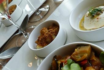 Nous avons choisi le 3 en 1 qui propose pour 25 € tout compris, tout dans la même assiette : une entrée froide - un tartare de bar aux graines de fruit de la passion - le plat du jour - un tajuine de légumes - et un dessert - une compote de poires à la vergeoise, un café et un beau verre de vin au choix. C'est bon et léger, élégamment servi, vite dégusté, et d'un excellent rapport qualité/prix, contrastant avec le prix d'entrée du musée.
