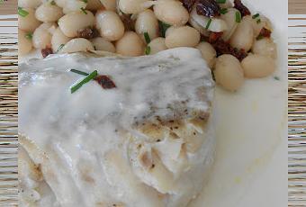 Pour 4 personnes : 4 filets de lieu, 500 g de cocos de Paimpol, 300 ml de crème, 20 g de beurre, 10 pétales de tomates confites, sel, poivre, bouquet garnit