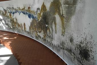 Il y a les murets et les sièges en briques rouges disposés en arrondi comme dans une salle de concert. Tout est disposé de la sorte : la fresque représentant des animaux autour d’une mare et dont une vidéo présente la manière dont elle a été ici et là brûlée avec de la poudre à canon (plus tard, nous irons rue Campagne Première où a vécu Yves Klein dont je garde le souvenir de toiles brûlées), les écrans montrant les parades nuptiales des oiseaux, les portraits d’animaux peints ou photographiés, autant de lignes courbes captant la lumière, invitant à la pause.