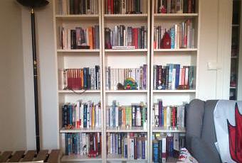 Mes livres sont dans le salon et sont classés par ordre alphabétique d’auteur, un classement adopté l’année dernière et que je trouve très pratique pour retrouver rapidement mes livres. Cela donne des voisinages cocasses mais aussi de la diversité dans la bibliothèque.