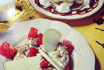 Pour ma part, j’ai testé quelque chose de plus léger avec quelques regrets car j’avais le ventre qui criait famine après mon assiette. Le « Muesli Power », 2 pancakes recouverts de fromage blanc fouetté, muesli, fruits frais et sirop d’érable. Un délice à 7,50€! MAIS qui ne vous garde pas rassasié pour très longtemps malheureusement. Je connais bien le proverbe mieux vaut la qualité que la quantité mais ces pancakes nous laissent un peu sur notre faim tout de même… Ma partenaire in crime de pancakes, elle a pris de pancakes avec beaucoup de chocolat, de banane et de chantilly, elle n’a pas été déçue!