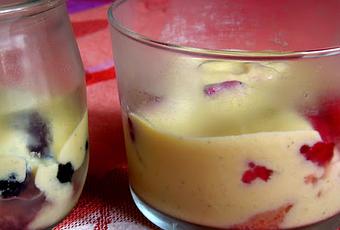 Ici, une confiture de mûres ou de framboises-groseilles a été déposée sur les biscuits puis une belle poignée du fruit frais avant de recouvrir de crème anglaise.