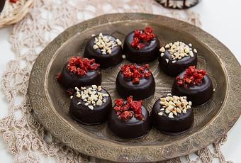 - تذاب الشوكولاته في حمام مائي تم تغمس الحلوی في الشوكولاته وتزين باللوز المجروش المحمص والفواكه المجففة.