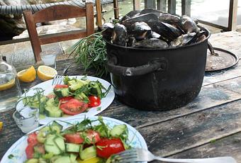 Niché dans une petite baie sauvage au bord de la mer Egée, un élevage de moules, soudain, apparait. Silence, beauté de l’eau et de la nature, le moteur du petit bateau au ralenti se faufile entre les pilons où sont accrochées les moules, considérées comme les meilleures du pays selon Dina Nikolaou, grâce au climat assez pluvieux, rare en Grèce, qui adoucit l’eau de mer comme les moules l’aiment.