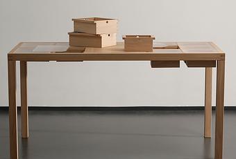 « It is made of oak a material traditionally used in everyday construction whose interesting grain markings combined with semi-transparent surfaces make for unique, contrasting patterns on the table surface« .