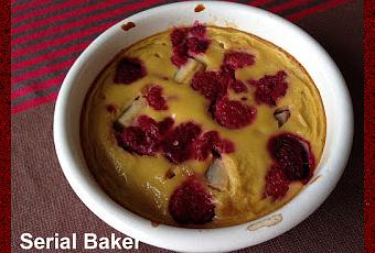 Graisser le(s) moule(s), répartir les morceaux de poire sur le fond puis les framboises. Verser la préparation de manière à recouvrir les fruits.