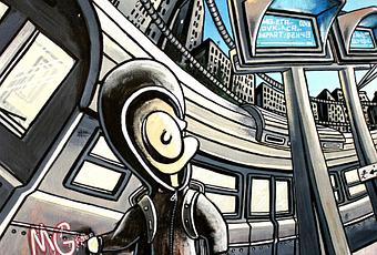 Pour ce solo show dont il est le héros, MG La Bomba a une très belle idée : il a intégré ses toiles dans le décor peint sur le mur. Un peu difficile à expliquer comme ça... Je vais quand même essayer ! L'artiste a repeint en totalité un des murs de la galerie. A la bombe, il a réalisé une histoire dessinée qui nous parle de graffeur (et d'amitié avec un petit message pour son ami Masson), de voie ferrée et de gare, de voyage dans l'espace urbain...