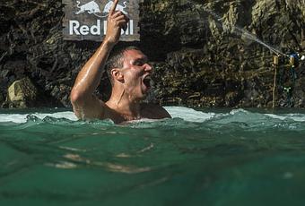 Le Tchèque Michal Navratil après le plongeon qui lui a permis de remporter l’étape galloise du Lagon Bleu (Olaf Pignatoro / Red Bull Content Pool)