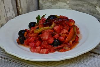 Mettre les lamelles de poivrons, les dès de tomates, les olives, les gousses d'ail pressée dans un récipient.
