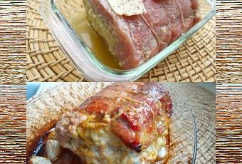 Ouvrir le rôti en deux et garnissez -le de farce à la pomme et à l'ail. Enroulez ensuite le rôti et ficelez-le sans trop serrer. Posez-le dans un plat allant au four.