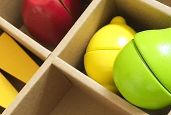 Après pas mal de recherches, j'ai finalement opté pour les fruits à découper de la marque Hape qui a de très belles valeurs et propose des jouets vraiment chouettes. Le concept de ces fruits à découper ? Des fruits colorés que l'on peut séparer (il y a un scratch au milieu) pour découvrir leurs coeurs. Le grand jeu consiste ensuite à les assembler à nouveau pour les ranger dans leur jolie boite. Le jeu est livré avec un adorable petit couteau en bois qui permet plus tard à l'enfant de faire semblant de découper ses fruits.