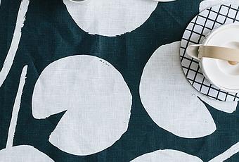 The new collection is called Water Lilies and is inspired by a photo taken by Elisabeth Dunker. This is more "grown-up" pattern than the previous ones, still they can all easily be mixed. Water Lilies comes as cushion cover, table cloth, tea towel, napkin, table runner, wool blanket, poster, card and fabric by the meter.
