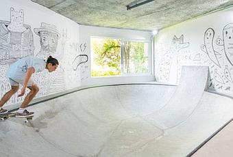Tout y est pensé pour ne jamais s’ennuyer ! Un petit lounge sous une vague en bois, une salle de gym, une mini salle de cinéma, et même un module de skatepark.