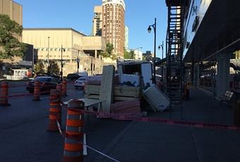 En sortant de la gare, rue Berri, le voyageur a deux choix: du côté nord, trottoir barré, cônes oranges et aucun passage piéton libre...