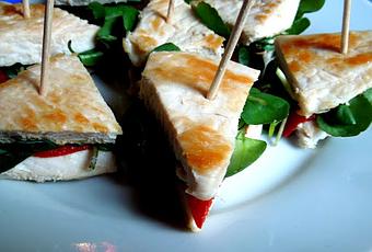 Monter les mini-clubs sandwichs en superposant un trainagle de dinde, quelques feuilles de cresson, le poivron et un deuxième triangle de dinde.