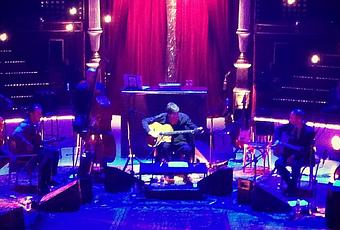 Attaché à respecter le thème de la soirée, il s’est néanmoins laissé tenter par quelques aventures musicales en interprétant certains de ses tubes (y compris « J’aime plus Paris« ), mais aussi quelques reprises (dont « Les Triplettes de Belleville« ). Pour cela, il ne va d’ailleurs pas hésiter à utiliser des machines et une guitare électrique, afin d’offrir une ré-interprétation culottée, mais respectueuse de ce répertoire qu’il apprécie tant. Le tout bien évidemment accompagné d’artistes incroyables et pleins de vie, à savoir : Pierre Blanchard et Aurore Voilqué au Violon, Raoul Chichin et Rocky Gresset à la guitare et Michel Portal à la clarinette.