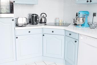 Je voulais quelque chose de doux et lumineux mais qui change de mon ancienne cuisine: meubles blancs et plan de travail bois. J'ai choisi un bleu très clair, un plan de travail blanc et quelques touches de noir. Cela ne plaira forcément pas à tout le monde. Je ne fais pas cet article pour vous convertir à ma passion pour le bleu mais pour vous montrer qu'avec un peu d'huile de coudes et un petit budget (500euros) on peut faire quelque chose de sympa.
